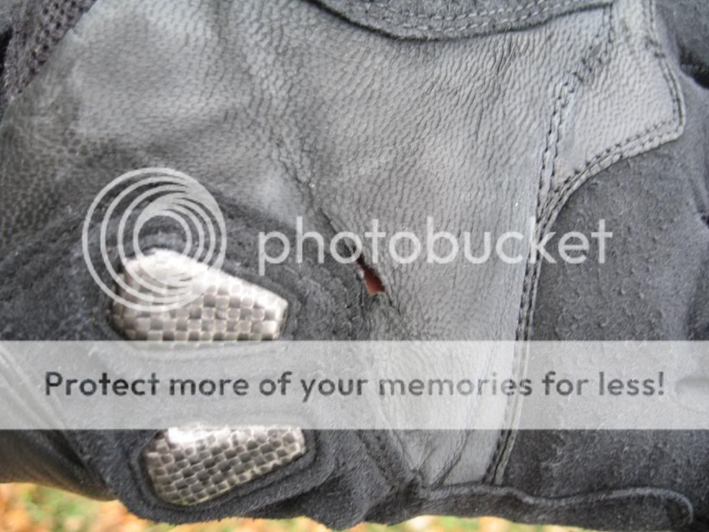 by the way, here's a pic of my insurrection gloves after a 150mph crash where i tumbled for 400+ feet. as you can see, slight scuffing, but thats it, no tears on the leather, nothin, going on 3 years of use at every track day and the majority of the year